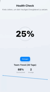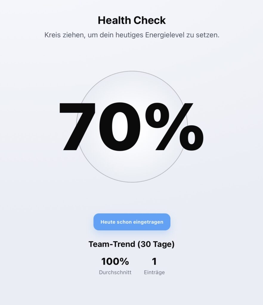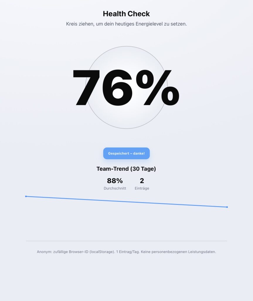 Das Tool erinnert Lehrkräfte einmal täglich, ihr persönliches Energielevel von 1–100 % zu bewerten. Aus den anonymisierten Daten entsteht ein Echtzeit-Index für individuelle und kollektive Belastung. Bei anhaltend niedrigen Werten werden Gespräche empfohlen – nicht als Kontrolle, sondern als wertschätzendes, kollegiales Feedbackformat. Damit schließt unser System die Lücke zwischen pädagogischem Anspruch und gesundheitsorientierter Organisationskultur.